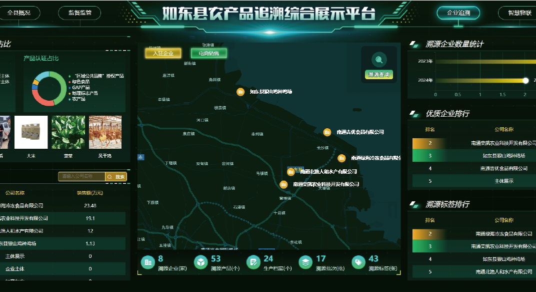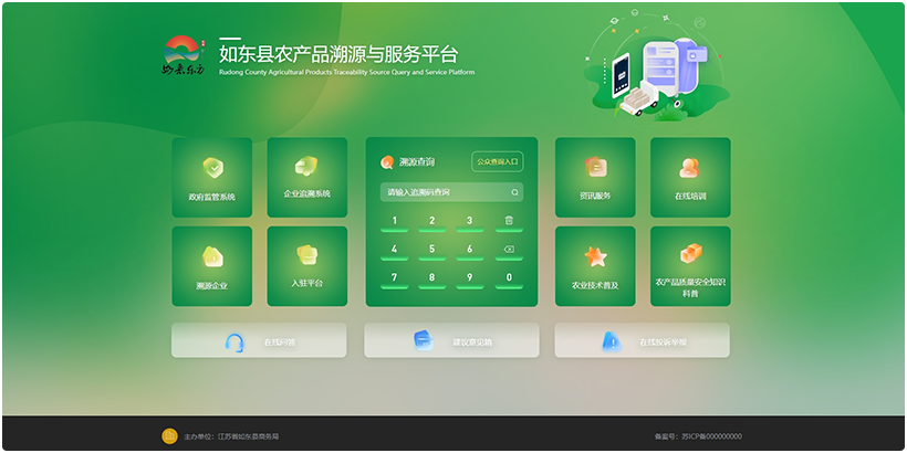 为加强如东农产品质量安全监管,园区依托江苏叁拾叁的技术力量,建立如东县农产品溯源与服务平台,为广大消费者提供“质量有保证、过程可追溯”的绿色健康农产品,为打造如东优质特色农产品,带动农民增产增收创造有利条件。