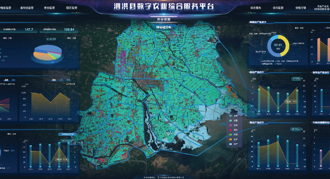 泗洪县建成集智慧农业生产经营体系、管理决策体系、监管服务应用体系和产业发展体系于一体的农业农村大数据管理中心,实现可视化、便捷化、智能化精准监管和服务,全面提升农业农村系统管理能力和服务水平。