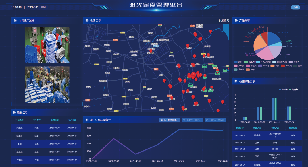 配合日产10万份学生餐要求,上海农场打造阳光定食中央厨房管理平台,集ERP、质量追溯、物流配送、线上销售、后厨可视化等功能为一体,自动生成各环节工作计划,实现运营管理的信息化、精准化、智能化。