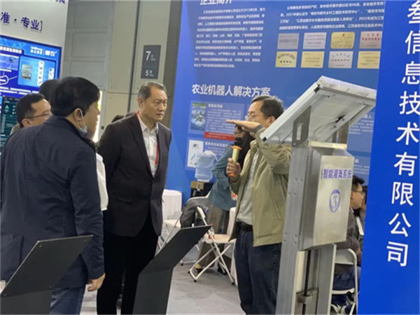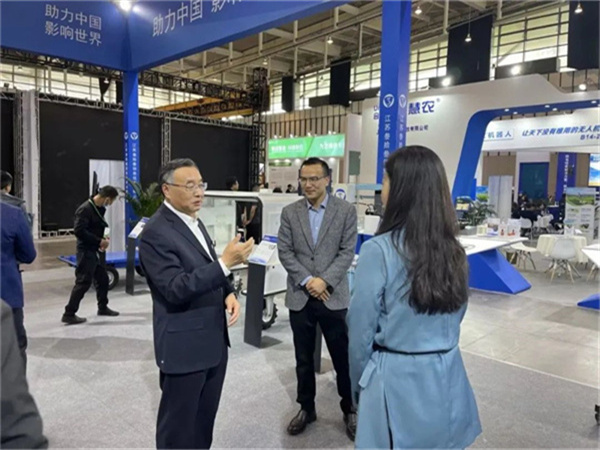 江苏省农业农村厅一级巡视员沈毅莅临展区现场,与江苏叁拾叁交流最新研发的智能机器人。