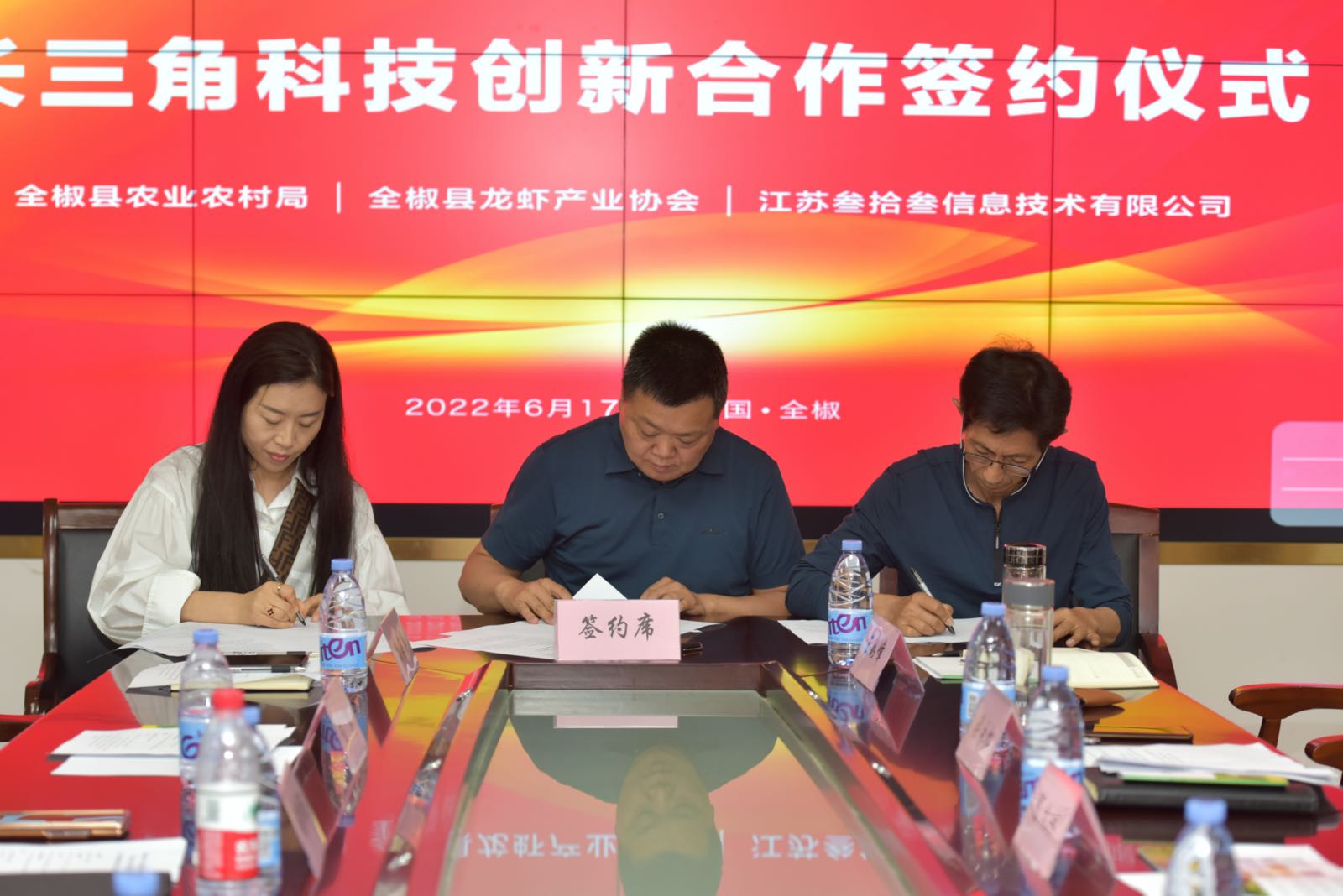 6月17日,江苏叁拾叁信息技术有限公司与全椒县农业农村局、全椒县龙虾产业协会进行长三角科技创新合作协议仪式合作签约仪式,全椒县农业农村局局长陈义水,全椒县龙虾产业协会会长王如峰、江苏叁拾叁董事长张梓强及三方相关部门负责人出席仪式现场。