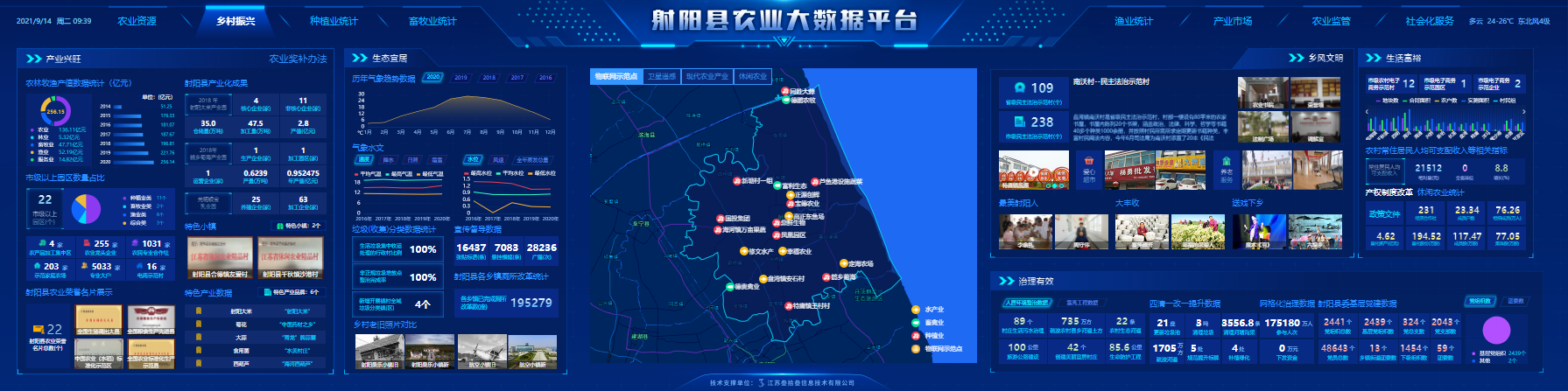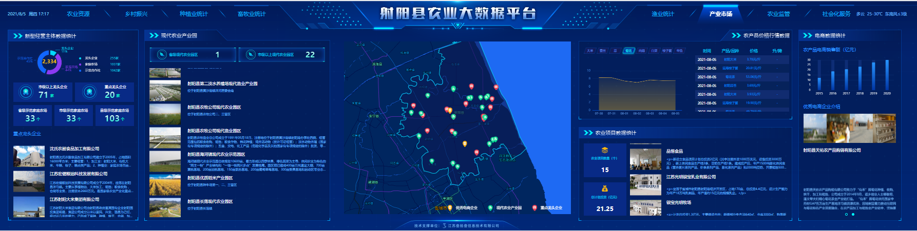 射阳县农业农村大数据平台立足农业部门领导决策、行业管理和服务农业生产经营的实际工作需求,为推动产业高质高效发展,接入19个物联网示范点,促进形成新品研发、绿色种植、加工仓储、产品销售等完整的产业链发展模式,实现了农产品的精准化农资配方、全天候监测管理、全流程追踪溯源、产销管全过程控制,加快了传统农业向现代农业的转变。目前,大米、菊花、乳业、水产等全产业链已经形成。