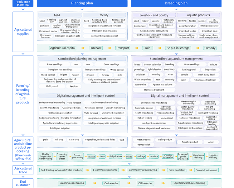 Vertically connect various stages of agricultural product production, optimize the management of seed selection, production, harvesting, and processing. Horizontally connecting the production, logistics, sales, finance and other links of agricultural products, achieving digital transformation and upgrading throughout the entire lifecycle of agricultural products, including seeds, agricultural materials, processing, logistics, and sales.