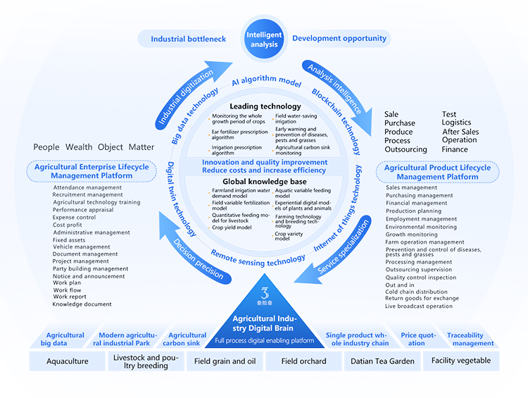 The "Agricultural Industry Digital Brain" full process digital empowerment platform is based on a three-layer architecture of information perception layer, data processing layer, and intelligent analysis layer. It collects, processes, analyzes, and applies data from the entire agricultural industry chain, achieving data empowerment for the entire process of agricultural production, processing, and sales. Vertically connect various stages of crop production, achieve rational allocation of temperature, light,